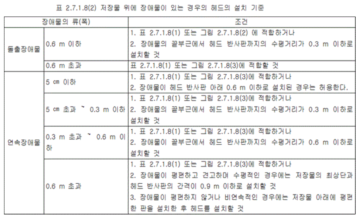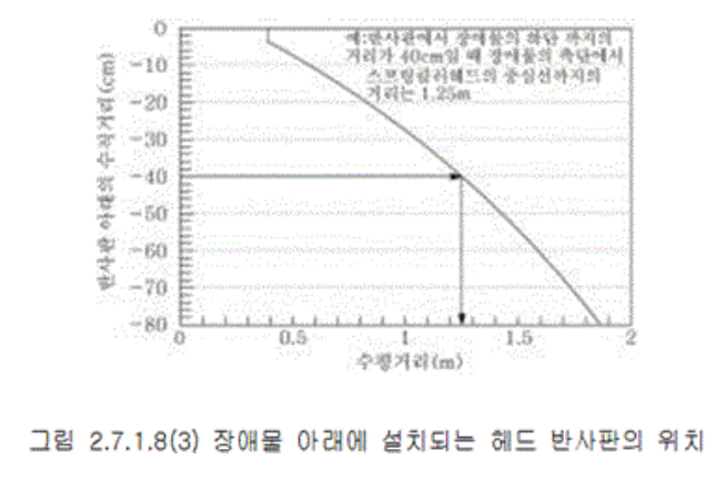 헤드 반사판은 장애물보다 높이 있어야 하며, 수직·수평 거리 기준은 NFTC 103 그림 2.7.1.8과 NFPC 103B 도표를 따라야 합니다.